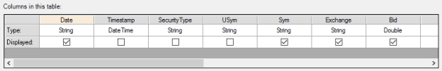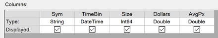 After selecting a table, the Columns panel will populate with the name and order of each column in the selected table. To include a column in the derived data, the check box must be selected for that column. To omit a column, deselect the check box. At least one column must be checked. If your selected table includes predefined formatting, you will see columns with 'WTABLE_NUM_FORMAT' in their name unchecked; these columns include the formatting data for their related columns. Unless you explicitly need to retrieve your Deephaven formatting for use in Excel, you should leave these columns unchecked.