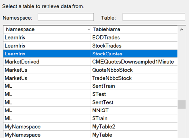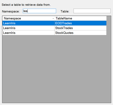 The Select a table panel allows you to select any table available in the system. Available tables are listed by namespace and table name. Both the Namespace and TableName columns can be sorted by clicking on the top row.