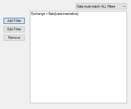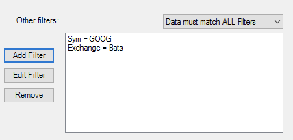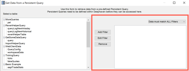 The match type drop-down in the upper right gives two options, ‘Data must match ALL Filters’ and ‘Data must match ANY Filter’. When this drop-down is set to ‘Data must match ALL Filters’, then the Get Persistent Query panel will return only rows where all the filter criteria are met separately (so if no filters are defined, all rows will be returned). When this drop-down is set to ‘Data must match ANY Filter’, then the add-in will return any row that matches at least one of the filter criteria (so if no filters are defined, no rows will be returned). Manage your filters with the Add, Edit, and Remove Filter buttons (see Filter Builder below).