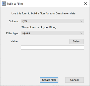 The Build A Filter dialog (or "filter builder") is used from the Get Persistent Query panel and the Get Table Data panel, allowing you to construct table-specific filters that restrict what data you get back from your query.