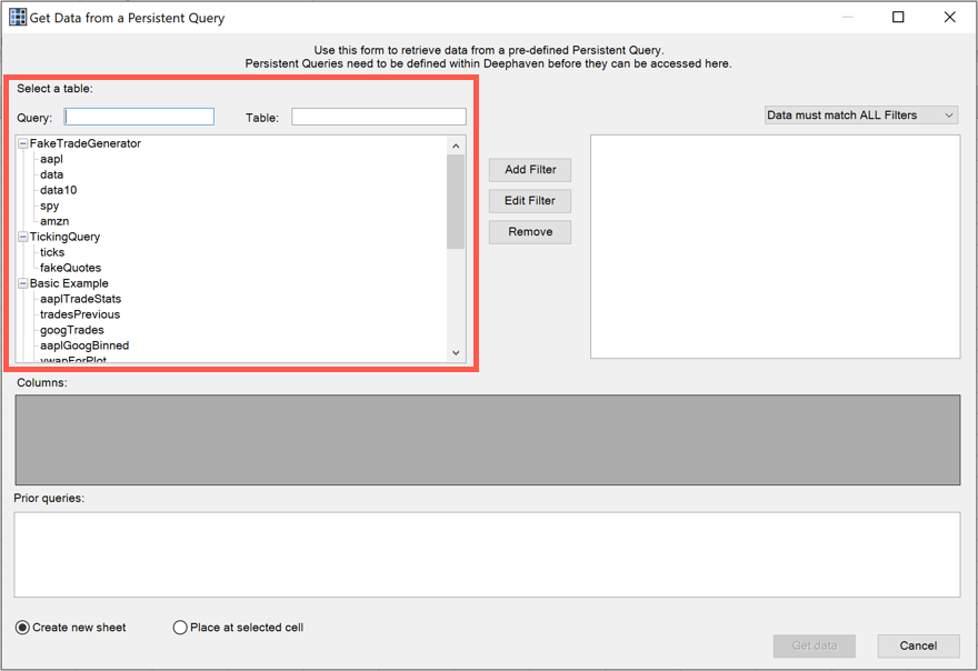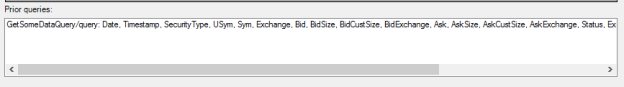 At the bottom of the Get Data from a Persistent Query panel is the Prior queries field. This field will show previous operations performed while in the current workbook. Each prior query entry will list the user-created 'friendly name' (if any), the name of the query, the name of the retrieved table, a list of the columns retrieved, and a list of the filters applied.