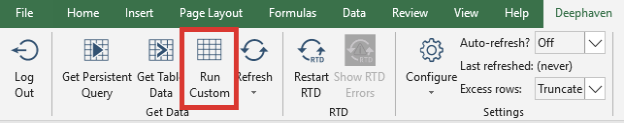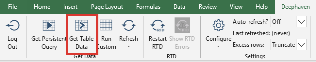 The Deephaven ribbon includes four buttons for getting and refreshing data from Deephaven. These are discussed individually below.