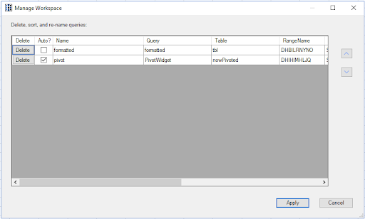 - The Delete button in each row allows you to remove this prior query from your workbook entirely. Deleted queries will no longer appear in the Prior Queries box, Refresh Last, or Manage Workspace.