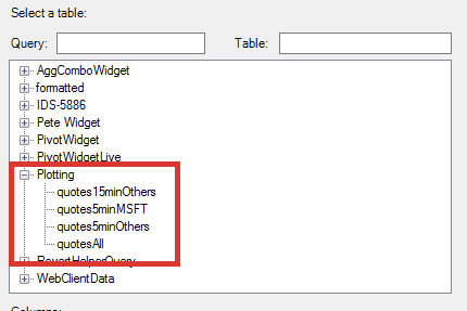 The Select a table control lists all of the Persistent Queries available to that user. The tables generated by that Persistent Query are indented under the query name.
