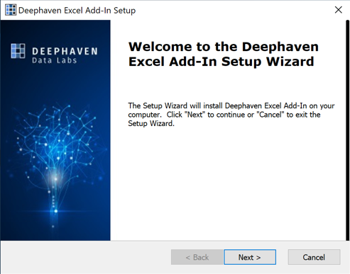 Opening the Deephaven Excel Add-In installer launches the Windows Setup Wizard, as shown below: