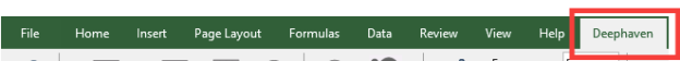 After the Deephaven Excel Add-in is installed (see instructions below), the available features will be presented in the Deephaven "ribbon" within Microsoft Excel. As shown below, Deephaven will appear near the right side in the Excel menu, similar to the way other Excel add-ins are displayed.
