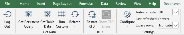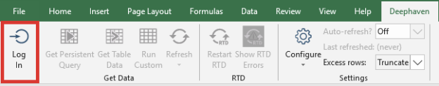 When you start Excel with the Deephaven ribbon installed, most of the options will initially be disabled, other than Log In and the Settings options.