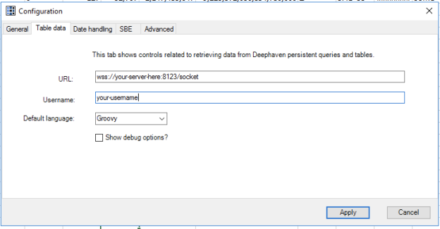 The Table Data tab contains controls relating to normal data retrieval from Deephaven. The following fields are presented: