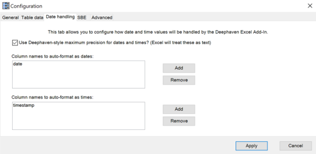 When this box is checked, the Deephaven Excel Add-In will return all of the available date information that is retrieved from Deephaven. However, Excel has limitations on how much precision it can display for sub-second values and time zone information. If this box is checked, dates will be treated as text values by Excel, but will have all the precision and time zone information available from Deephaven.