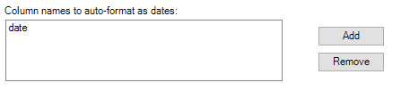 The Auto-Format Dates section allows you to specify the names of individual columns that should always be formatted as dates only when returned from Deephaven, when using full precision. Clicking the Add button will open a dialog allowing you to enter the name of a column to always format as a date. If you have selected a row in the Auto-Format Dates section, the Remove button will remove that column from the list. Columns auto-formatted as dates will be returned in the form yyyy-mm-dd, with no time information attached. In this format, the 18th of April in 1775 at six forty-three and twelve seconds and seventy-five microseconds in the afternoon in the Eastern time zone would be displayed as 1775-04-18, with no time information displayed.