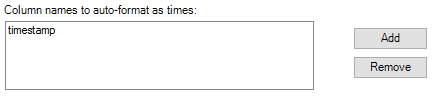 The Auto-Format Times section allows you to specify the names of individual columns that should always be formatted as times only when returned from Deephaven, when using full precision. Clicking the Add button will open a dialog allowing you to enter the name of a column to always format as a time. If you have selected a row in the Auto-Format Times section, the Remove button will remove that column from the list. Columns auto-formatted as times will be returned in the form hh:mm:ss.fff, with no date information attached. In this format, the 18th of April in 1775 at six forty-three and twelve seconds and seventy-five microseconds in the afternoon in the Eastern time zone would be displayed as 18:43:12.075, with no date information displayed.