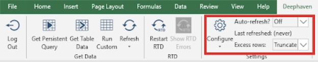 The Excess Rows drop-down menu to the right of the Configure button allows you to modify what the Deephaven Excel Add-In will do if it attempts to retrieve more rows than it can handle.
