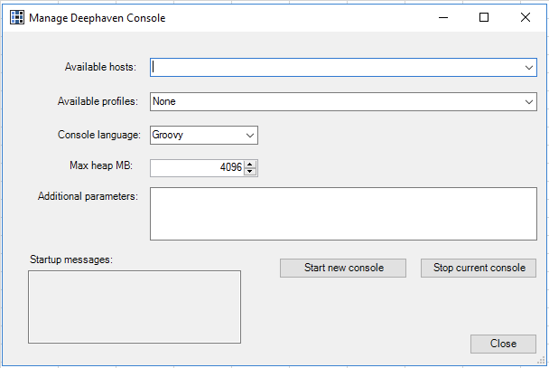 Any users familiar with creating consoles via Deephaven's own core interface will be familiar with these options. Not all of the options available in Deephaven's core interface are available from the Deephaven Excel Add-In; if you require those advanced features, please use Deephaven's core interfaces.
