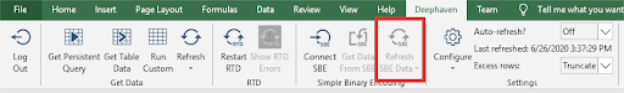 When the Configuration setting in the SBE tab for Show SBE section is selected, a new Simple Binary Encoding section is added to the Deephaven ribbon, as shown below.
