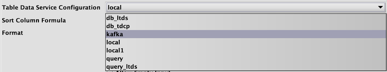 The above example corresponds to the routing entries which include original local (local1) and kafka under local. If desired, tags can be used to restrict which TableDataService entries are shown in the UI. See: Data Routing Configuration via YAML